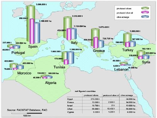 Olive Productions varies yearly, mainly because of fluctuating weather conditions. Olive Productions in the Mediterranean basin for 1998, from the FAOSTAT database, is shown below.